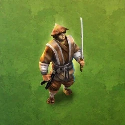 The Bushi (武士 in Japanese) wears an Asian conical hat, a beige robe and vest, grey belt, brown pants, and sandals. He is holding a katana which is a curved sword.